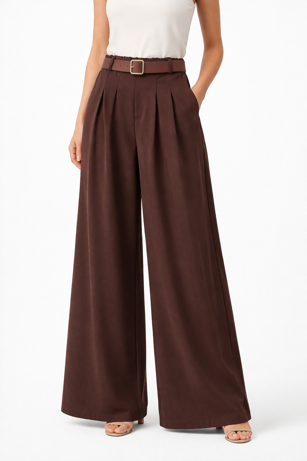 Bruine Wide Leg Palazzo Broek Dames – Hoge Taille met Riem – Elegant & Comfort Fit