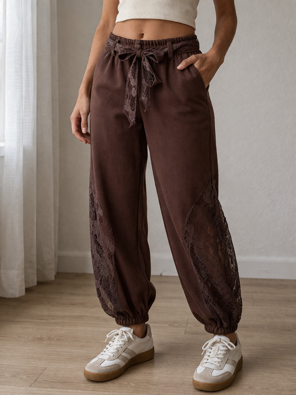 Deze choco bruine broek combineert comfort met een elegante uitstraling. De zachte viscosemix voelt soepel en licht aan op de huid, terwijl het subtiele kantdetail zorgt voor een verfijnde en vrouwelijke touch.